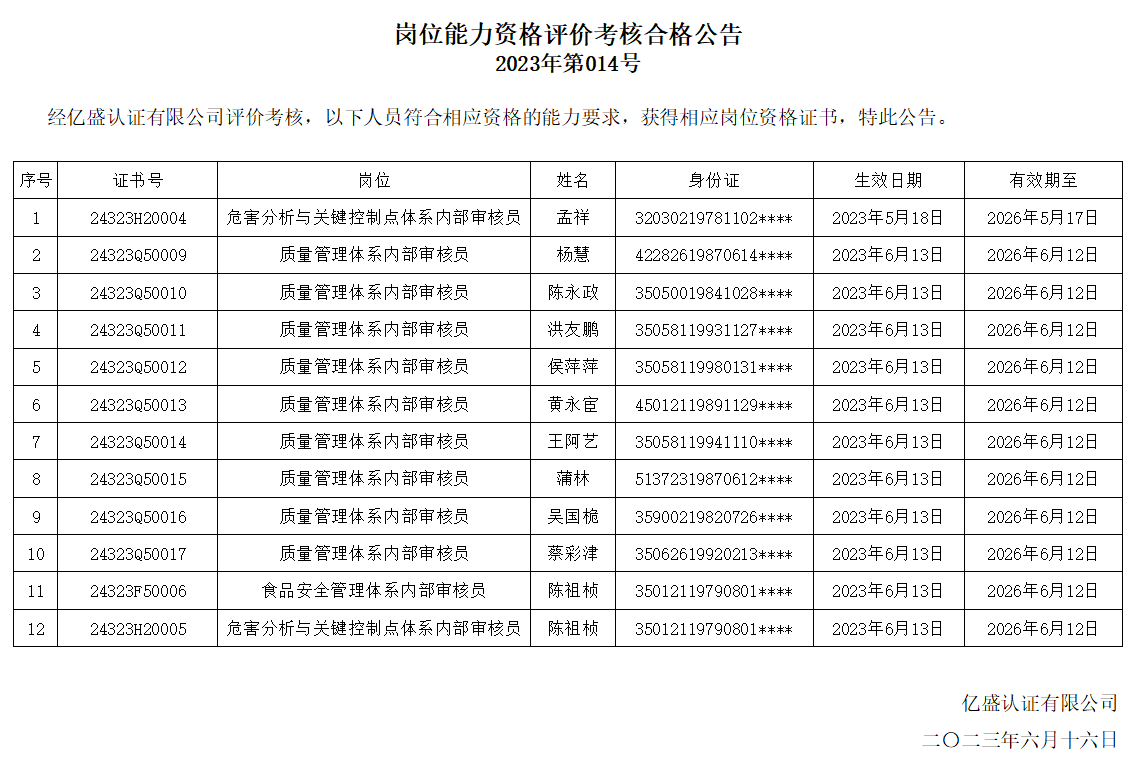 岗位能力资格评价考核合格公告 2023年第014号