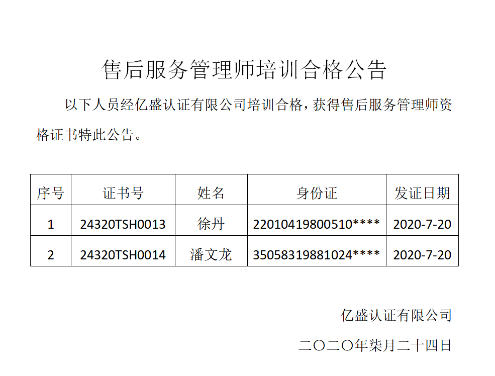 售后服务管理师培训合格公告