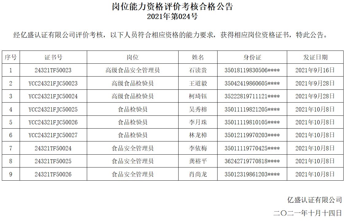 岗位能力资格评价考核合格公告2021年第024号