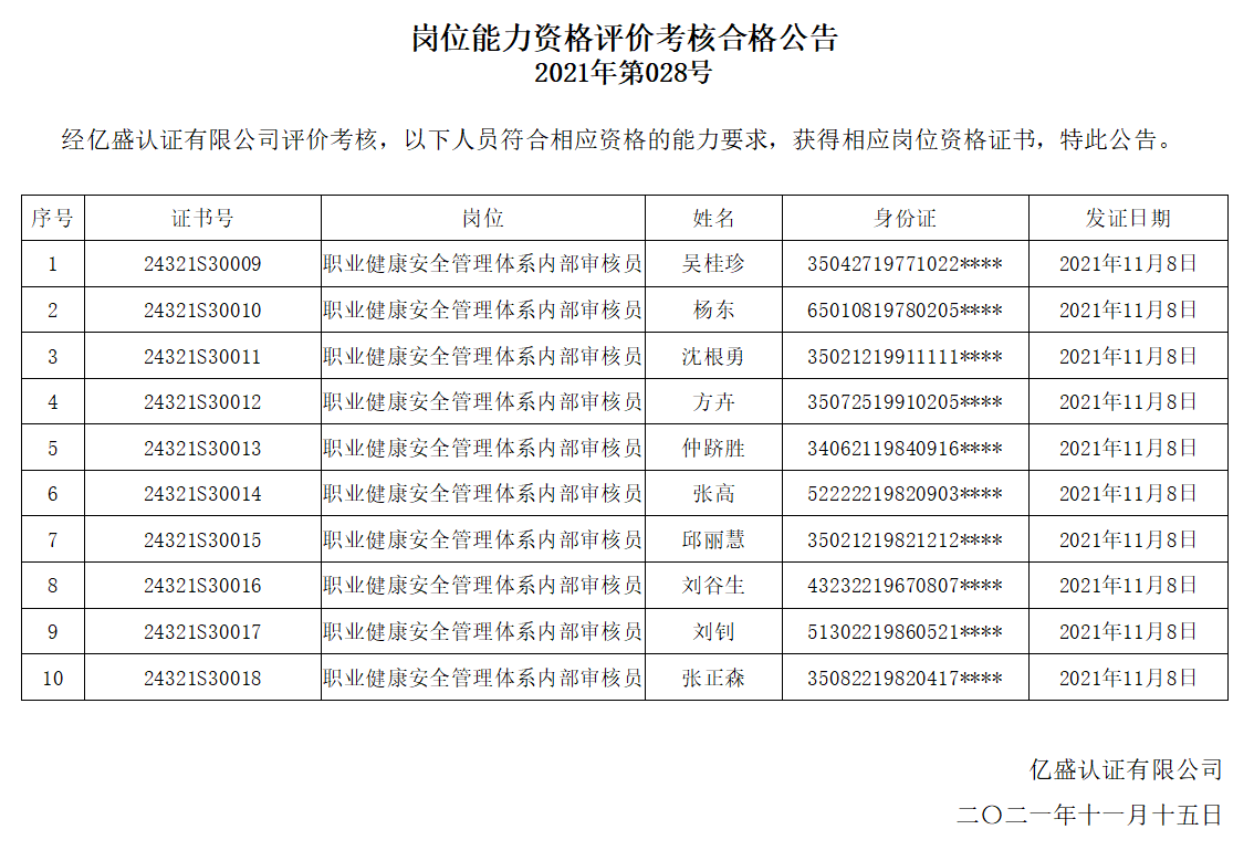 岗位能力资格评价考核合格公告2021年第028号