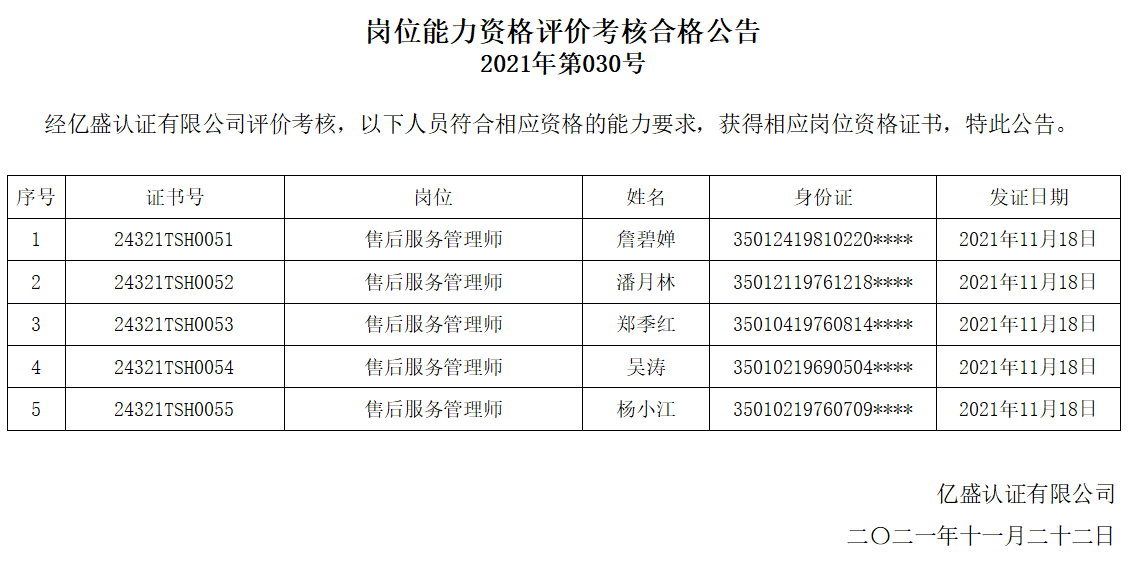 岗位能力资格评价考核合格公告2021年第030号